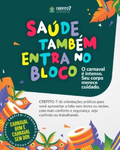 O Conselho Regional de Fisioterapia e Terapia Ocupacional da 7ª Região (CREFITO-7) lança uma campanha educativa com orientações e dicas práticas para evitar dores e prevenir lesões durante o período do Carnaval. A iniciativa é voltada tanto para foliões quanto para trabalhadores que atuam na festa. Intitulada “Saúde também entra no bloco”, a campanha reforça que aproveitar a folia com responsabilidade e cuidado deve ser prioridade na maior festa popular do planeta.